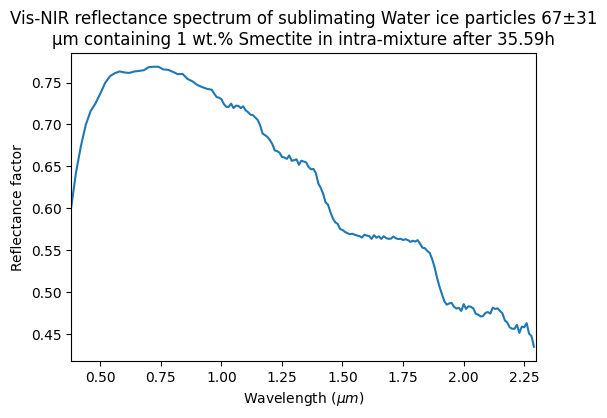 Vis-NIR reflectance spectrum of sublimating Water ice particles 67±31 μm containing 1 wt.% Smectite in intra-mixture after 35.59h