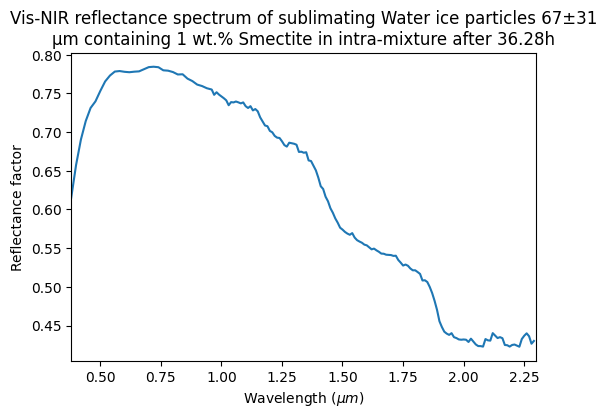 Vis-NIR reflectance spectrum of sublimating Water ice particles 67±31 μm containing 1 wt.% Smectite in intra-mixture after 36.28h