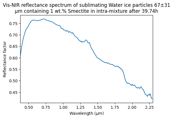 Vis-NIR reflectance spectrum of sublimating Water ice particles 67±31 μm containing 1 wt.% Smectite in intra-mixture after 39.74h