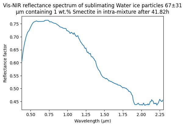 Vis-NIR reflectance spectrum of sublimating Water ice particles 67±31 μm containing 1 wt.% Smectite in intra-mixture after 41.82h