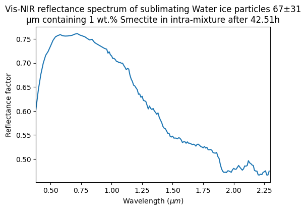 Vis-NIR reflectance spectrum of sublimating Water ice particles 67±31 μm containing 1 wt.% Smectite in intra-mixture after 42.51h