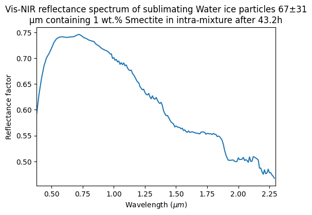 Vis-NIR reflectance spectrum of sublimating Water ice particles 67±31 μm containing 1 wt.% Smectite in intra-mixture after 41.82h