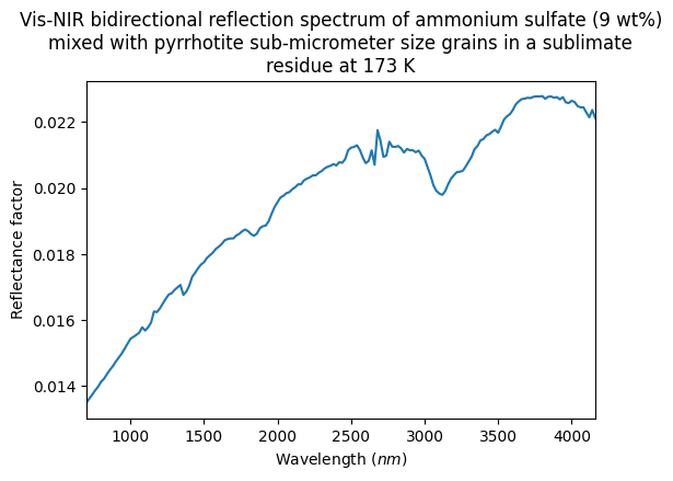 - Poch, Olivier; Istiqomah, Istiqomah (2018): Vis-NIR bidirectional reflection spectra of several ammonium salts mixed with pyrrhotite grains in sublimate residues at 173 K. SSHADE/GhoSST (OSUG Data Center). Dataset/Spectral Data. https://doi.org/10.26302/SSHADE/EXPERIMENT_OP_20191119_001