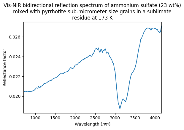 - Poch, Olivier; Istiqomah, Istiqomah (2018): Vis-NIR bidirectional reflection spectra of several ammonium salts mixed with pyrrhotite grains in sublimate residues at 173 K. SSHADE/GhoSST (OSUG Data Center). Dataset/Spectral Data. https://doi.org/10.26302/SSHADE/EXPERIMENT_OP_20191119_001