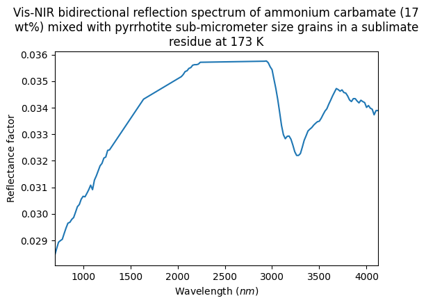 - Poch, Olivier; Istiqomah, Istiqomah (2018): Vis-NIR bidirectional reflection spectra of several ammonium salts mixed with pyrrhotite grains in sublimate residues at 173 K. SSHADE/GhoSST (OSUG Data Center). Dataset/Spectral Data. https://doi.org/10.26302/SSHADE/EXPERIMENT_OP_20191119_001