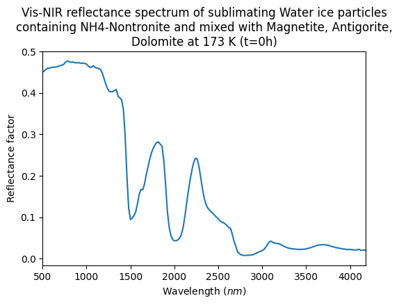 Vis-NIR reflectance spectrum of sublimating Water ice particles containing NH4-Nontronite and mixed with Magnetite, Antigorite, Dolomite at 173 K (t=0h)