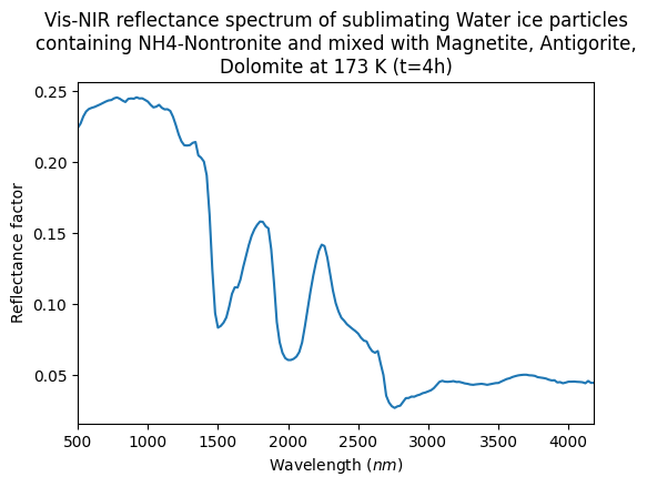 Vis-NIR reflectance spectrum of sublimating Water ice particles containing NH4-Nontronite and mixed with Magnetite, Antigorite, Dolomite at 173 K (t=4h)