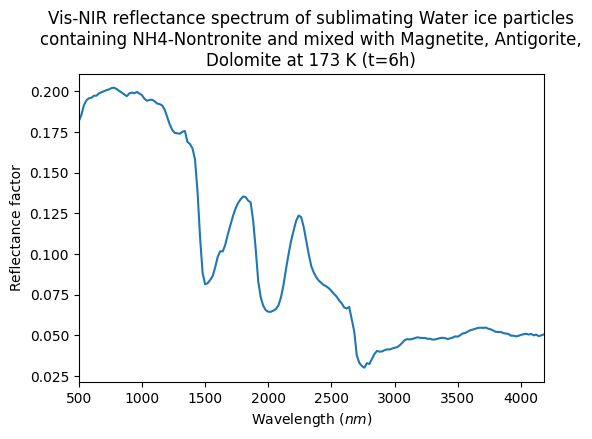 Vis-NIR reflectance spectrum of sublimating Water ice particles containing NH4-Nontronite and mixed with Magnetite, Antigorite, Dolomite at 173 K (t=6h)