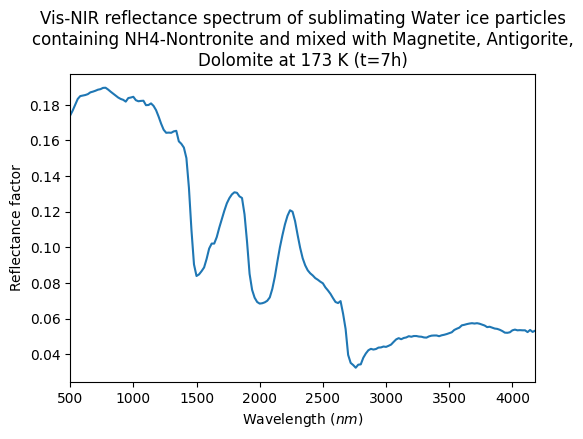 Vis-NIR reflectance spectrum of sublimating Water ice particles containing NH4-Nontronite and mixed with Magnetite, Antigorite, Dolomite at 173 K (t=7h)