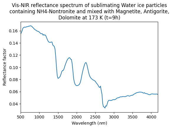 Vis-NIR reflectance spectrum of sublimating Water ice particles containing NH4-Nontronite and mixed with Magnetite, Antigorite, Dolomite at 173 K (t=9h)