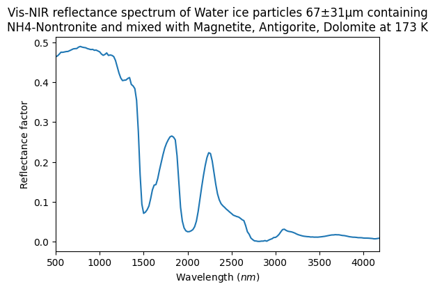 - Schroeder, Stefan; Poch, Olivier; Ferrari, Marco; DeAngelis, Simone (2019): Vis-NIR reflectance spectra of a mixture of Magnetite, NH4-Nontronite, Antigonite and Dolomite, pure, mixed with Water ice, during and after ice sublimation. SSHADE/CSS (OSUG Data Center). Dataset/Spectral Data. https://doi.org/10.26302/SSHADE/EXPERIMENT_OP_20200623_001