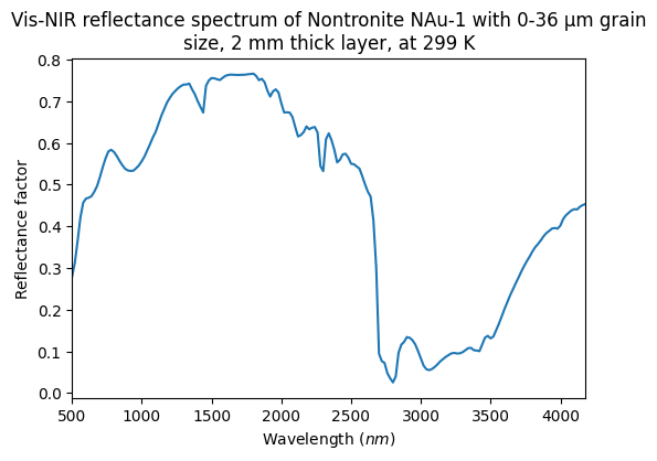 - Schroeder, Stefan; Poch, Olivier; Ferrari, Marco; DeAngelis, Simone (2019): Vis-NIR reflectance spectra of Nontronite NAu-1, pure, mixed with Water ice, during and after ice sublimation. SSHADE/CSS (OSUG Data Center). Dataset/Spectral Data. https://doi.org/10.26302/SSHADE/EXPERIMENT_OP_20200701_001
