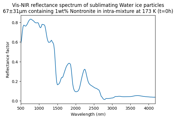 Vis-NIR reflectance spectrum of sublimating Water ice particles 67±31μm containing 1wt% Nontronite in intra-mixture at 173 K (t=0h)