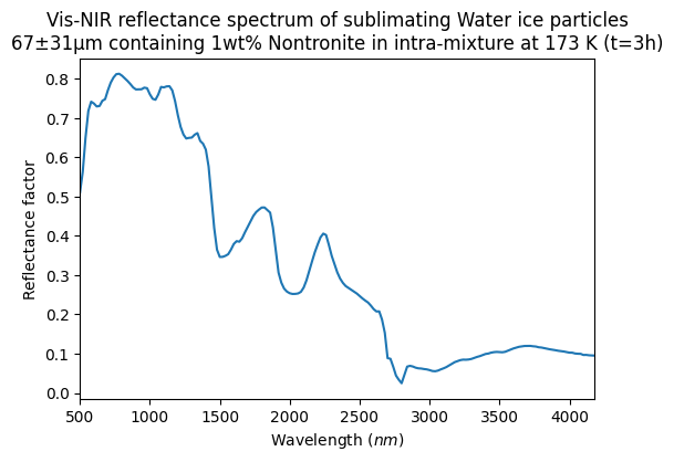 Vis-NIR reflectance spectrum of sublimating Water ice particles 67±31μm containing 1wt% Nontronite in intra-mixture at 173 K (t=3h)
