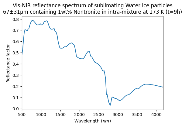 Vis-NIR reflectance spectrum of sublimating Water ice particles 67±31μm containing 1wt% Nontronite in intra-mixture at 173 K (t=9h)