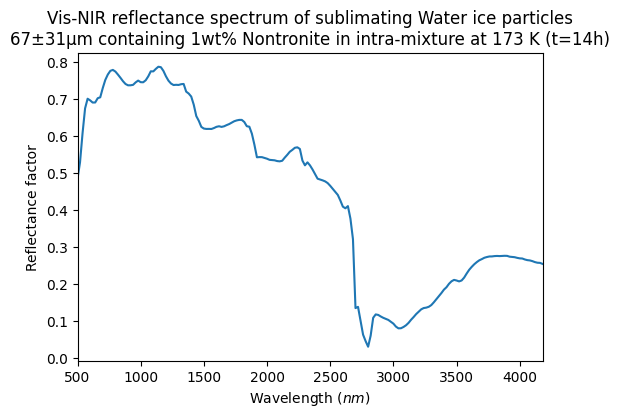 Vis-NIR reflectance spectrum of sublimating Water ice particles 67±31μm containing 1wt% Nontronite in intra-mixture at 173 K (t=14h)