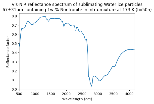 Vis-NIR reflectance spectrum of sublimating Water ice particles 67±31μm containing 1wt% Nontronite in intra-mixture at 173 K (t=50h)