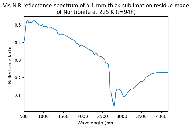 - Schroeder, Stefan; Poch, Olivier; Ferrari, Marco; DeAngelis, Simone (2019): Vis-NIR reflectance spectra of Nontronite NAu-1, pure, mixed with Water ice, during and after ice sublimation. SSHADE/CSS (OSUG Data Center). Dataset/Spectral Data. https://doi.org/10.26302/SSHADE/EXPERIMENT_OP_20200701_001