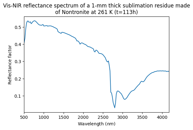 - Schroeder, Stefan; Poch, Olivier; Ferrari, Marco; DeAngelis, Simone (2019): Vis-NIR reflectance spectra of Nontronite NAu-1, pure, mixed with Water ice, during and after ice sublimation. SSHADE/CSS (OSUG Data Center). Dataset/Spectral Data. https://doi.org/10.26302/SSHADE/EXPERIMENT_OP_20200701_001