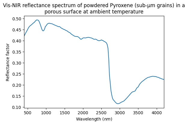- Sultana, Robin (2018): Vis-NIR reflectance spectra of powdered olivine, pyroxene, smectite and silica at 4 different grain sizes (from sub-µm to 200 µm) and with sub-µm grains in compact or porous surfaces. SSHADE/GhoSST (OSUG Data Center). Dataset/Spectral Data. https://doi.org/10.26302/SSHADE/EXPERIMENT_OP_20200908_001