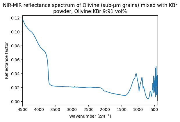 - Olivine (sub-micrometre sized grains) mixed with KBr powder, Olivine:KBr 9:91 vol%
