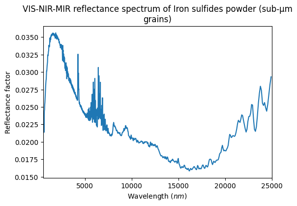 - Sultana, Robin (2019): VIS-NIR-MIR Reflectance spectra of mixtures of sub-µm grains of Olivine with Iron Sulfides or Anthracite, at different concentrations. SSHADE/GhoSST (OSUG Data Center). Dataset/Spectral Data. https://doi.org/10.26302/SSHADE/EXPERIMENT_OP_20230207_001