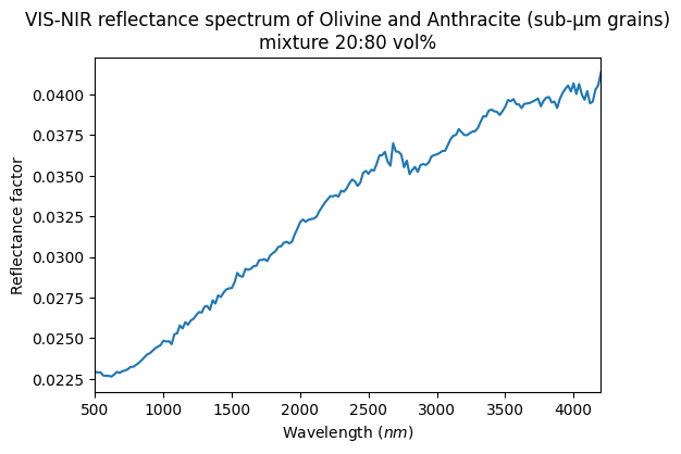 - Sultana, Robin (2019): VIS-NIR-MIR Reflectance spectra of mixtures of sub-µm grains of Olivine with Iron Sulfides or Anthracite, at different concentrations. SSHADE/GhoSST (OSUG Data Center). Dataset/Spectral Data. https://doi.org/10.26302/SSHADE/EXPERIMENT_OP_20230207_001