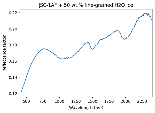 - Yoldi, Zuriñe (2018): VIS-NIR reflectance spectra of binary mixtures between the fine fraction of the JSC Lunar regolith simulant (JSC-1AF) and two types of spherical water ice particles. SSHADE/BYPASS (OSUG Data Center). Dataset/Spectral Data. https://doi.org/10.26302/SSHADE/EXPERIMENT_ZY_20180110_002