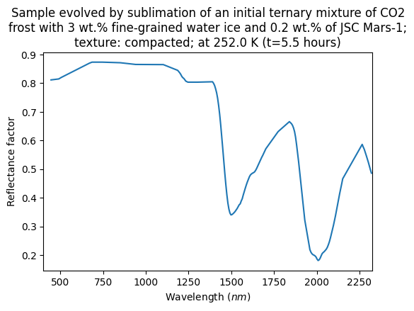 - Yoldi, Zuriñe (2018): VIS-NIR reflectance spectra collected during a sublimation experiment with ternary mixtures of CO2 frost, spherical water ice particles and JSC Mars-1 regolith simulant. SSHADE/BYPASS (OSUG Data Center). Dataset/Spectral Data. https://doi.org/10.26302/SSHADE/EXPERIMENT_ZY_20180207_000