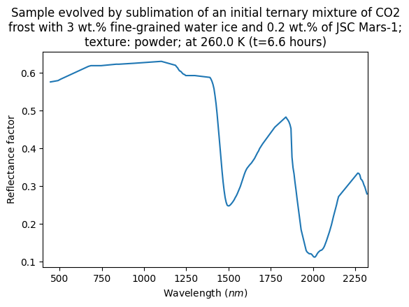 - Yoldi, Zuriñe (2018): VIS-NIR reflectance spectra collected during a sublimation experiment with ternary mixtures of CO2 frost, spherical water ice particles and JSC Mars-1 regolith simulant. SSHADE/BYPASS (OSUG Data Center). Dataset/Spectral Data. https://doi.org/10.26302/SSHADE/EXPERIMENT_ZY_20180207_000