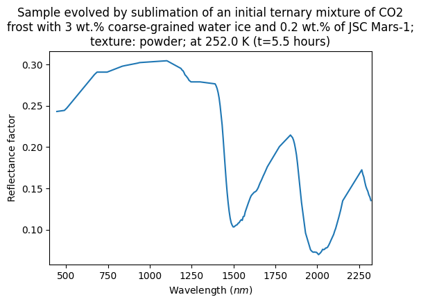 - Yoldi, Zuriñe (2018): VIS-NIR reflectance spectra collected during a sublimation experiment with ternary mixtures of CO2 frost, spherical water ice particles and JSC Mars-1 regolith simulant. SSHADE/BYPASS (OSUG Data Center). Dataset/Spectral Data. https://doi.org/10.26302/SSHADE/EXPERIMENT_ZY_20180207_000