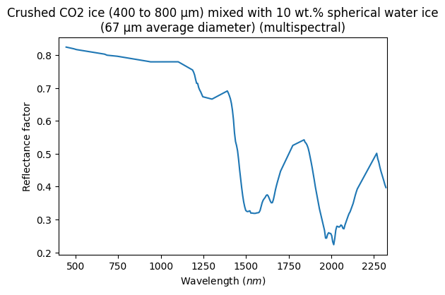 - Yoldi, Zuriñe (2018): VIS-NIR reflectance spectra of binary mixtures of coarse-grained crushed CO2 ice particles (400-800 µm) and spherical water ice particles (67 µm average diameter). SSHADE/BYPASS (OSUG Data Center). Dataset/Spectral Data. https://doi.org/10.26302/SSHADE/EXPERIMENT_ZY_20180213_000