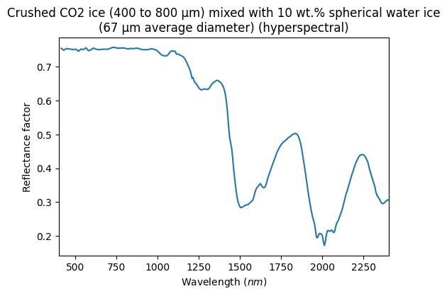 - Yoldi, Zuriñe (2018): VIS-NIR reflectance spectra of binary mixtures of coarse-grained crushed CO2 ice particles (400-800 µm) and spherical water ice particles (67 µm average diameter). SSHADE/BYPASS (OSUG Data Center). Dataset/Spectral Data. https://doi.org/10.26302/SSHADE/EXPERIMENT_ZY_20180213_000