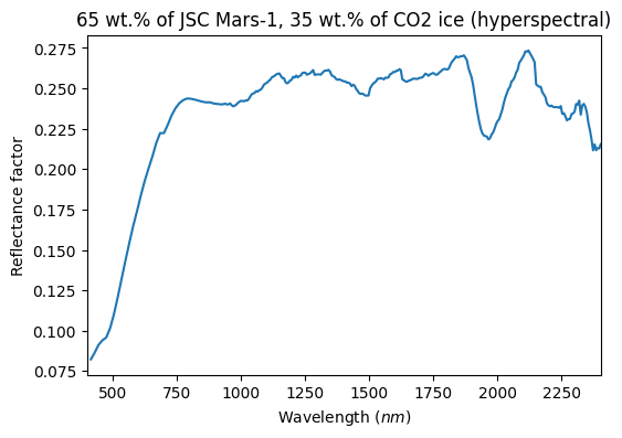 - Yoldi, Zuriñe (2018): VIS-NIR reflectance spectra of binary mixtures of particulate CO2 ice (400-800 µm) and regolith simulant JSC Mars-1 in variable amount. SSHADE/BYPASS (OSUG Data Center). Dataset/Spectral Data. https://doi.org/10.26302/SSHADE/EXPERIMENT_ZY_20180216_000