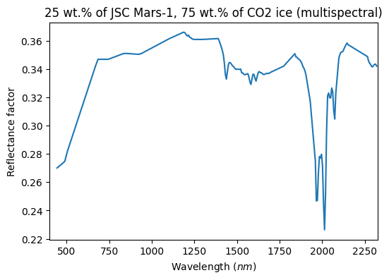 - Yoldi, Zuriñe (2018): VIS-NIR reflectance spectra of binary mixtures of particulate CO2 ice (400-800 µm) and regolith simulant JSC Mars-1 in variable amount. SSHADE/BYPASS (OSUG Data Center). Dataset/Spectral Data. https://doi.org/10.26302/SSHADE/EXPERIMENT_ZY_20180216_000