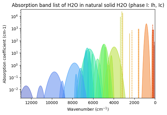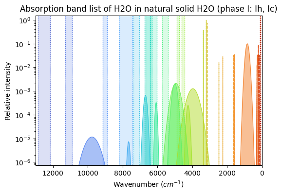 Absorption band list of H2O in natural solid H2O (phase I: Ih, Ic)