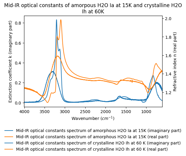 - Mid-IR optical constants spectrum of amorpous H2O Ia at 15K and crystalline H2O Ih at 60K