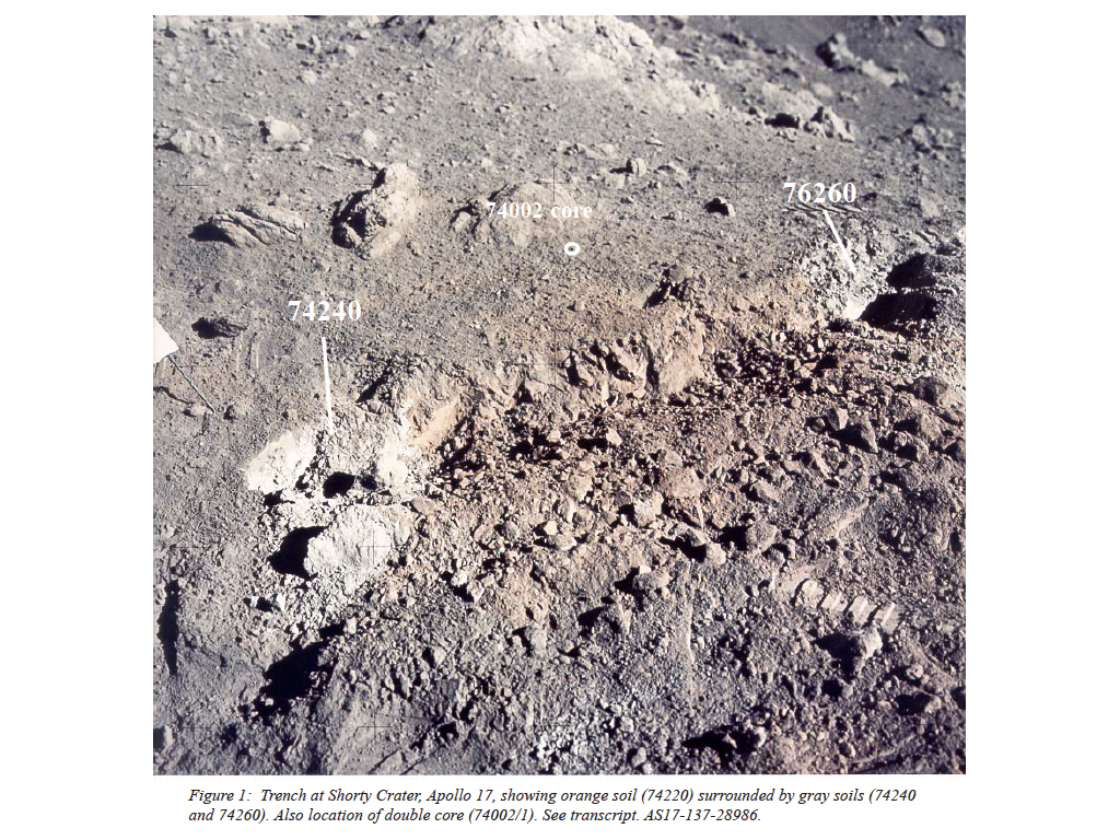Station 4, on the rim of Shorty Crater. Gray soil bordering a 1 m wide band of orange soil on the southern edge of a 5-8 cm deep trench.