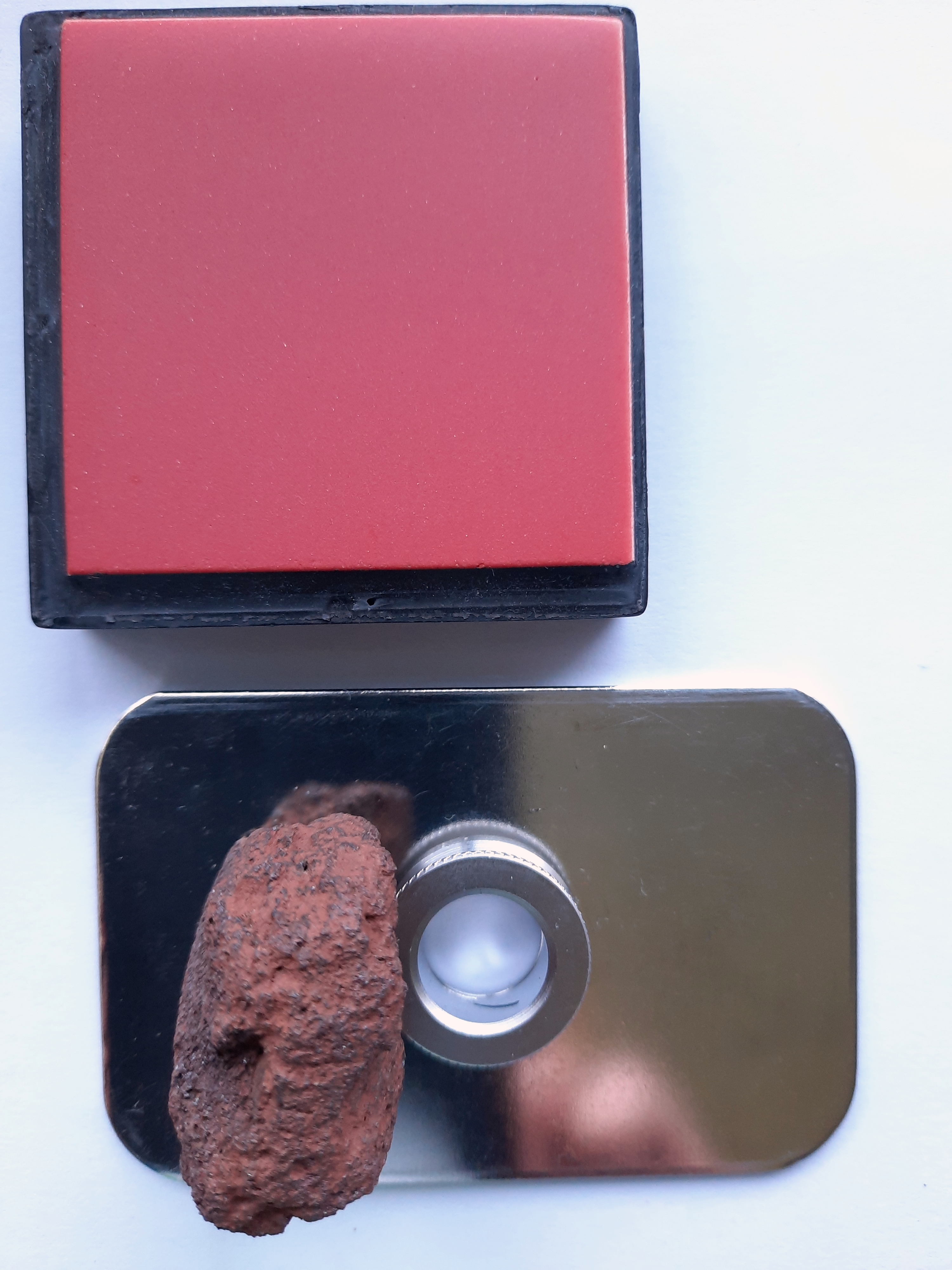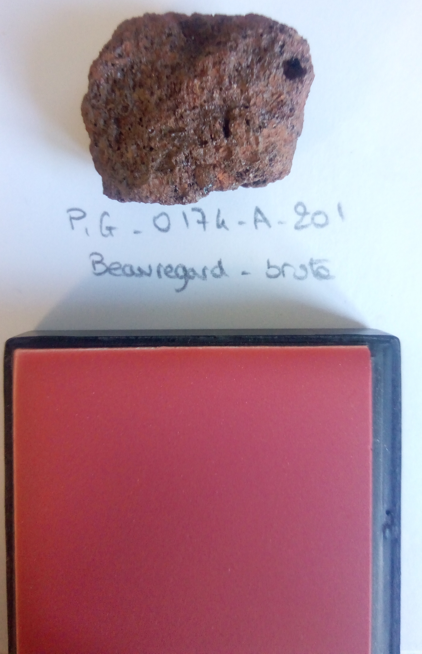 - equant shaped block with approximate size 31x22x18 mm, red with a brown-black fresh faces